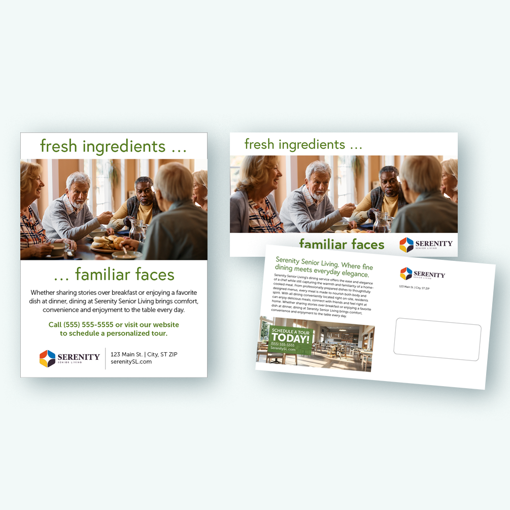 Dining print ad campaign that includes a full-color print ad and oversized postcard design.