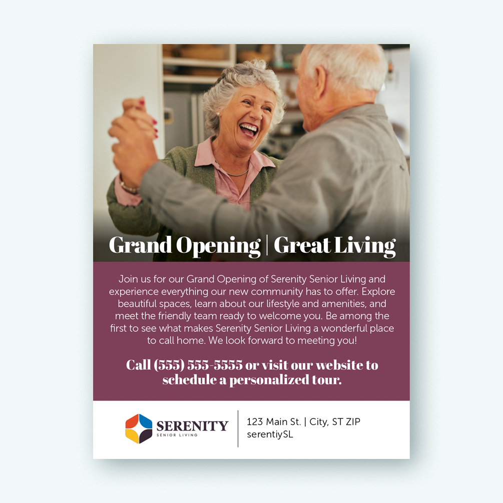 Grand Opening print ad campaign that includes a full-color print ad and oversized postcard design.