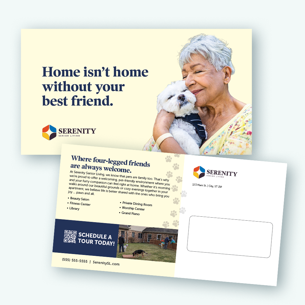 Pet-Friendly campaign. 11×6 full-color, double-sided oversized postcard.