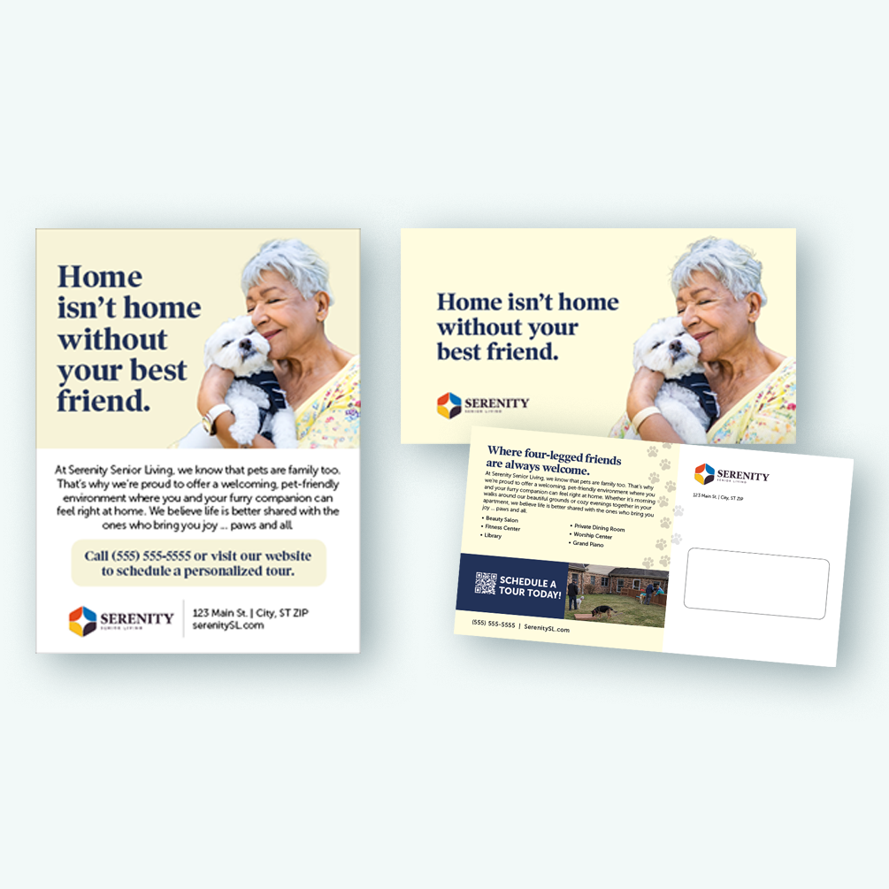 Pet-Friendly print ad campaign that includes a full-color print ad and oversized postcard design.
