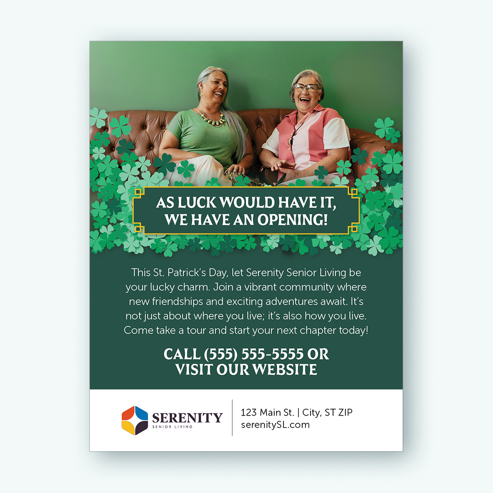 St. Patrick’s Day print ad campaign that includes a full-color print ad and oversized postcard design.